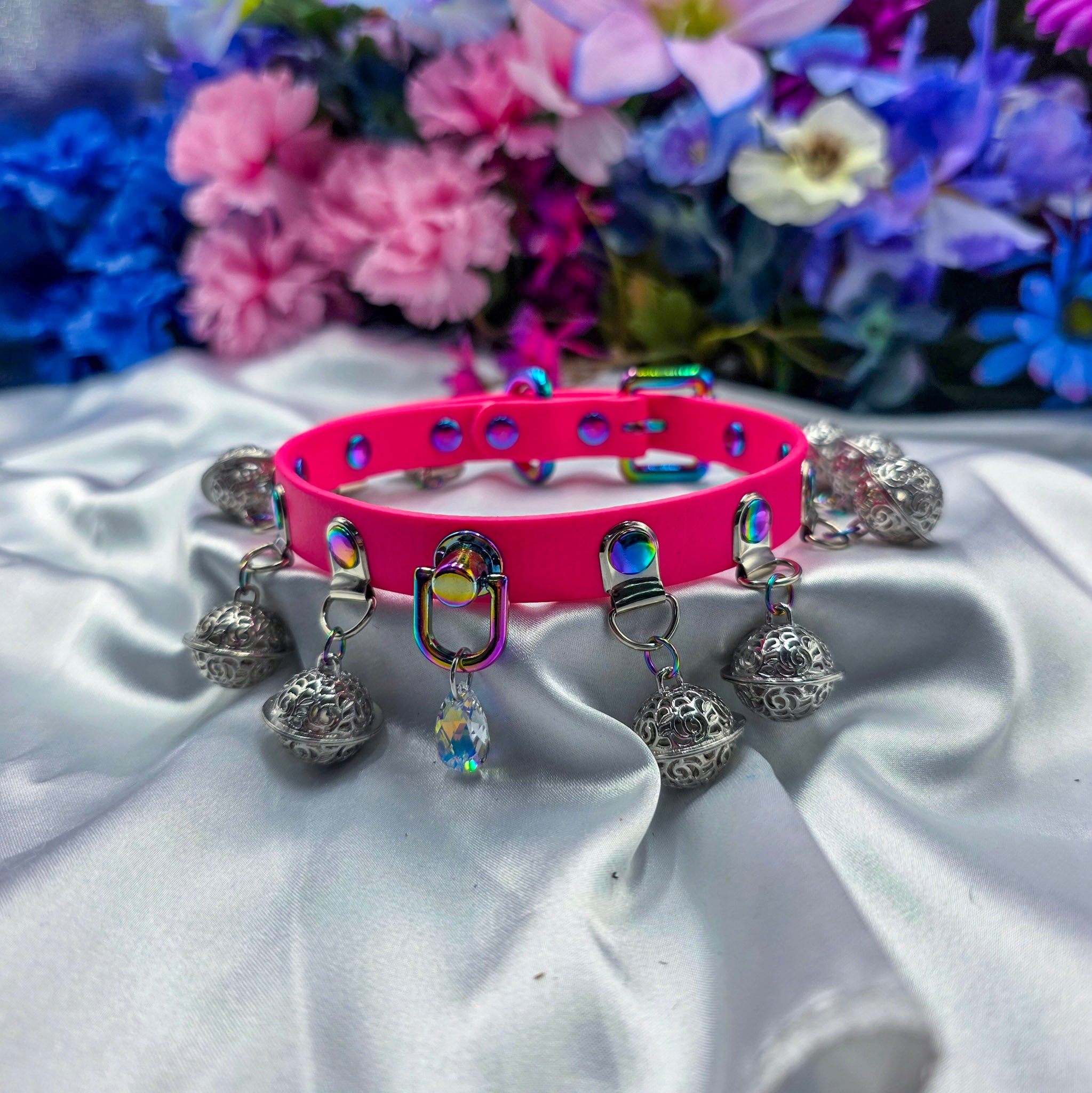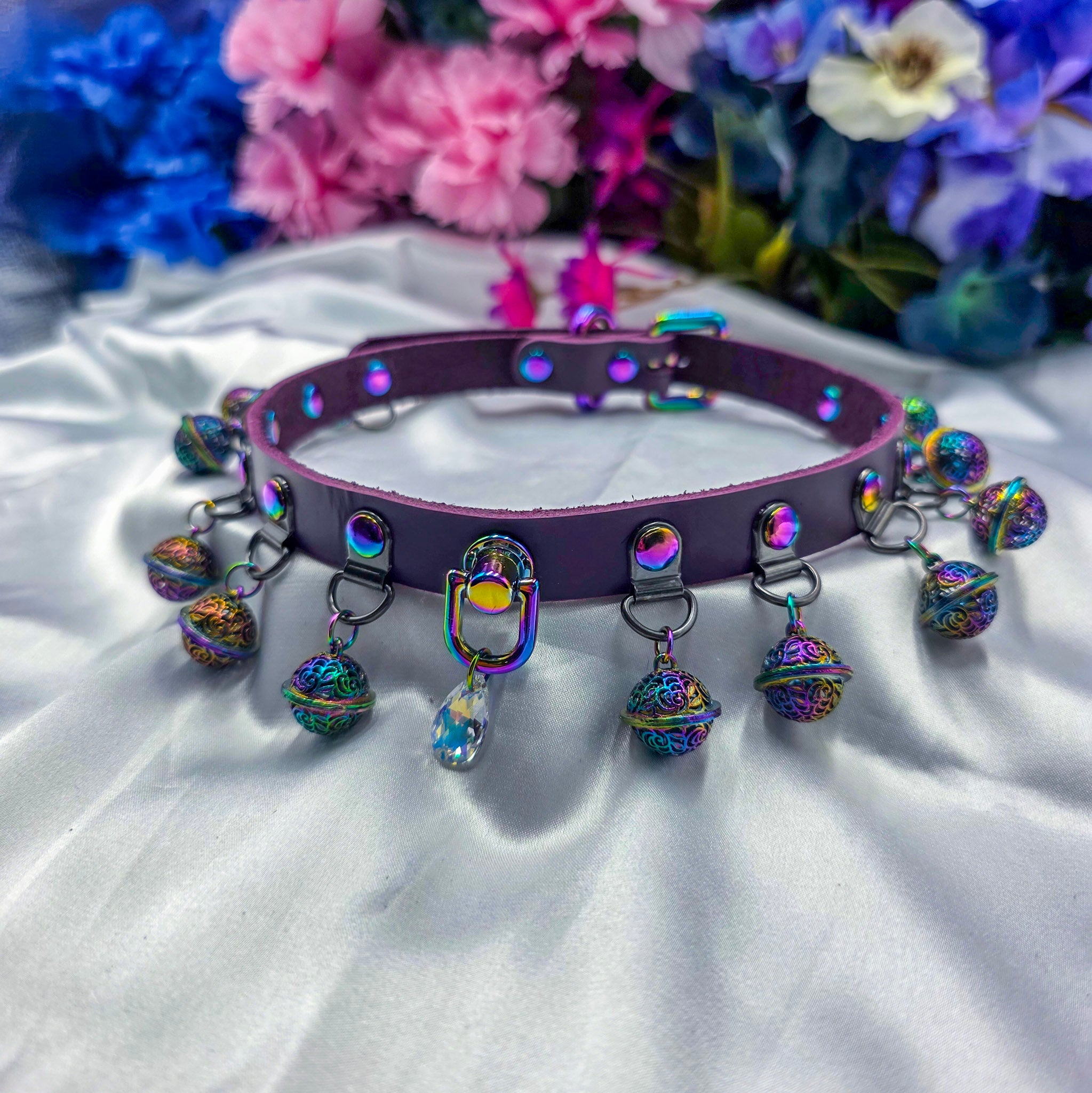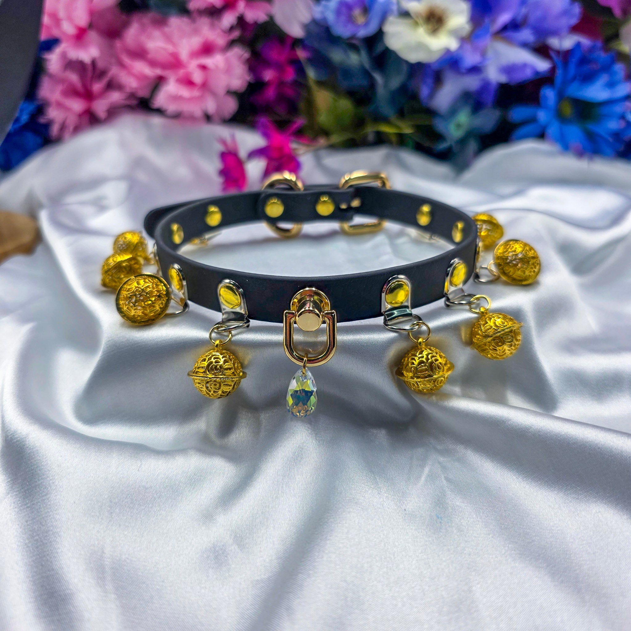This design is based off one of my older designs with ornate bells dangling on the entire length of the collar with a sparkling Swarovski Aurora Borealis crystal charm. It's quite loud but has a soft ringing and is the perfect choker/collar for when you need to always hear someone. That cat is not sneaking away.