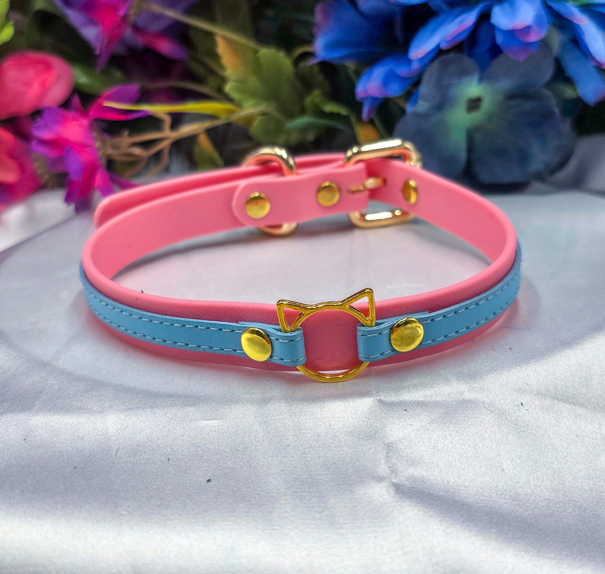 Another take on the classic dual layered collar but with a front cat ring! Rivets on the side of the cat ring can be replaced with spikes via add-ons.