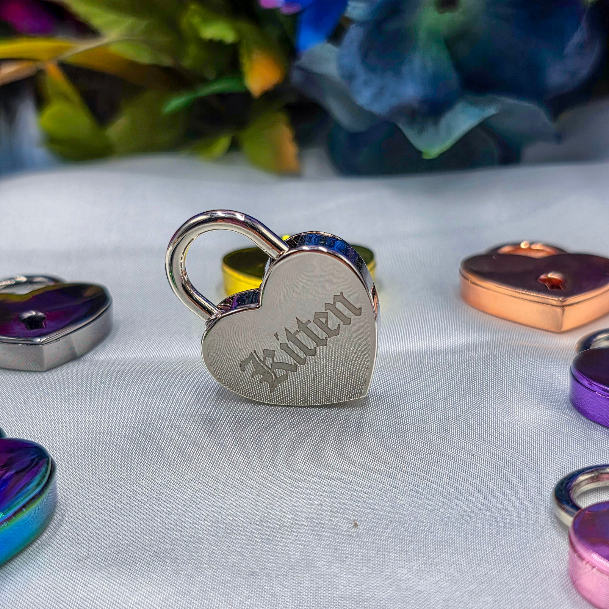 Personalize/Customize your own heart shaped lock with your own words. Can be single or double sided engraved to add to any collar/choker.