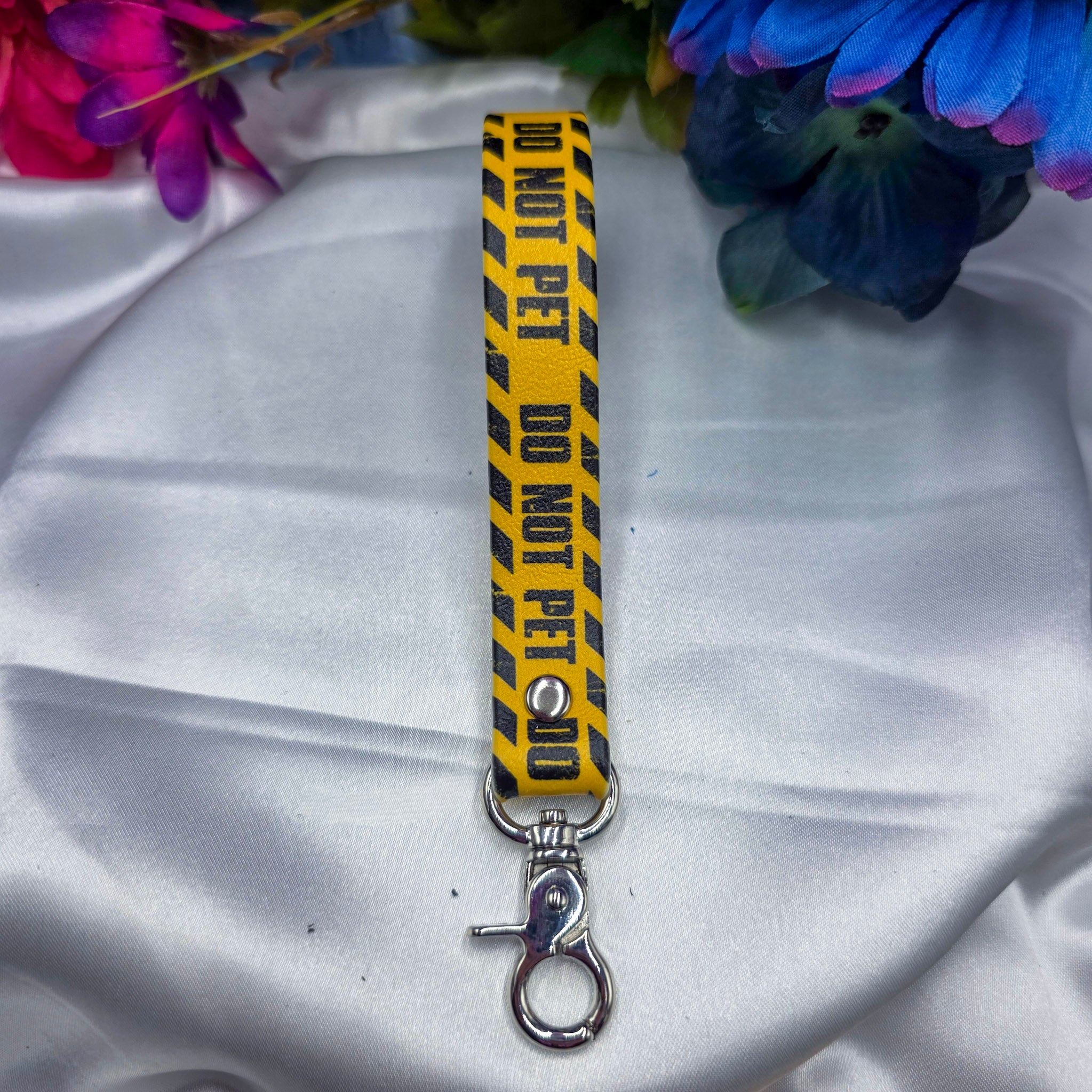 A new tester product for the shop, little wristlets to hold your keys/charms/trinkets! Made with various Caution prints in a UV Printed Biothane.