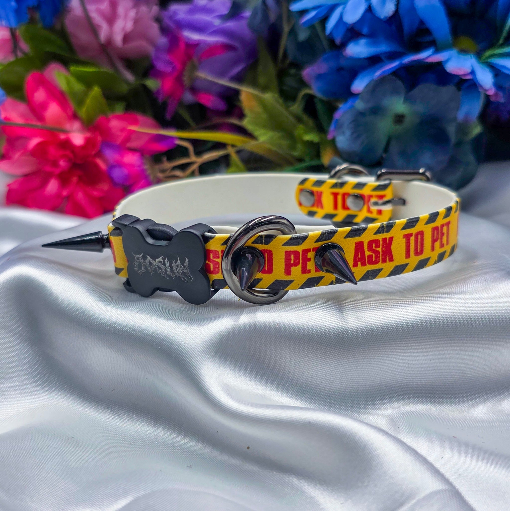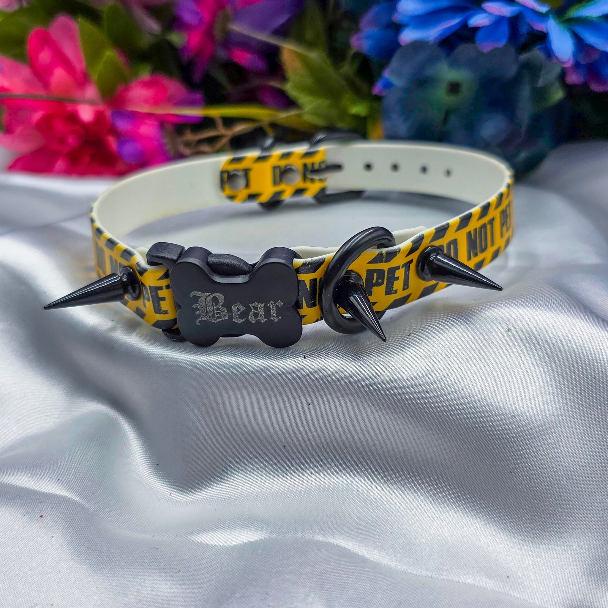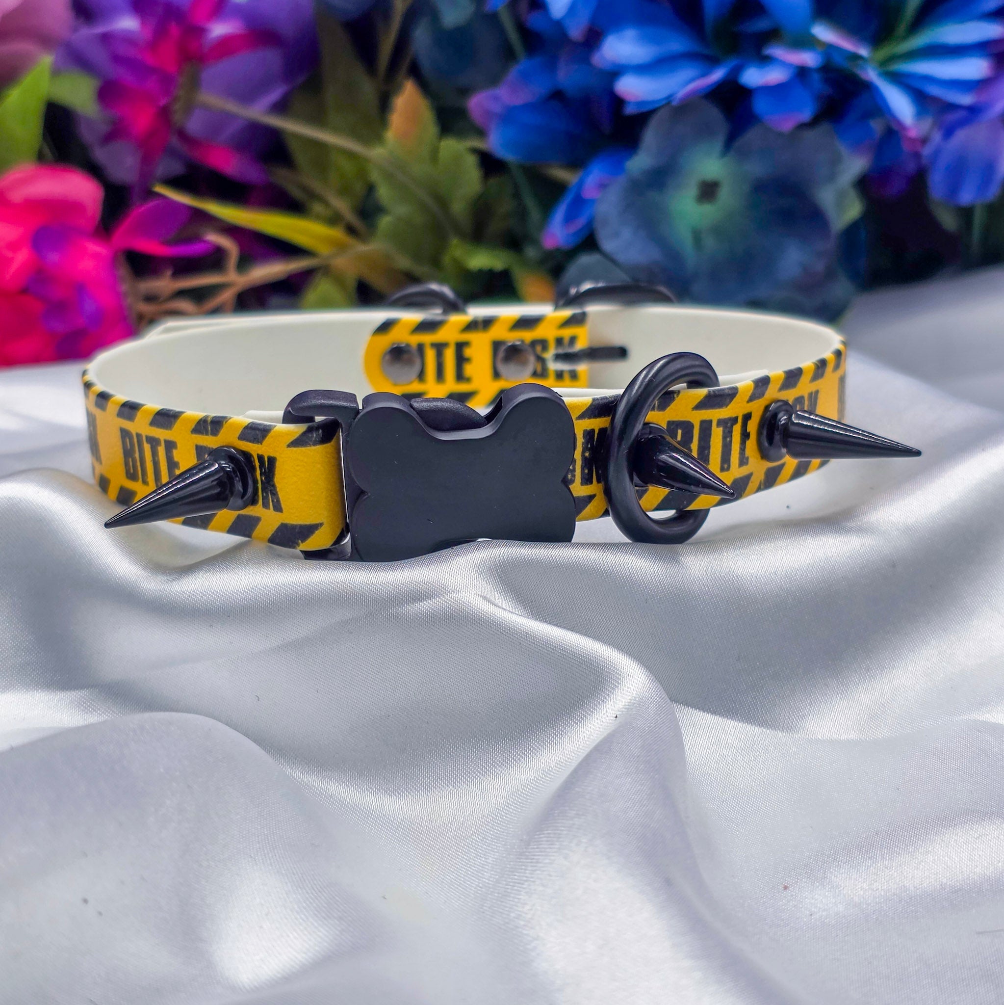 These are made in the Faux Puppy style with a signature bone shaped front buckle and adjustable back buckle. All are made with matte black hardware and have matte black large spikes.