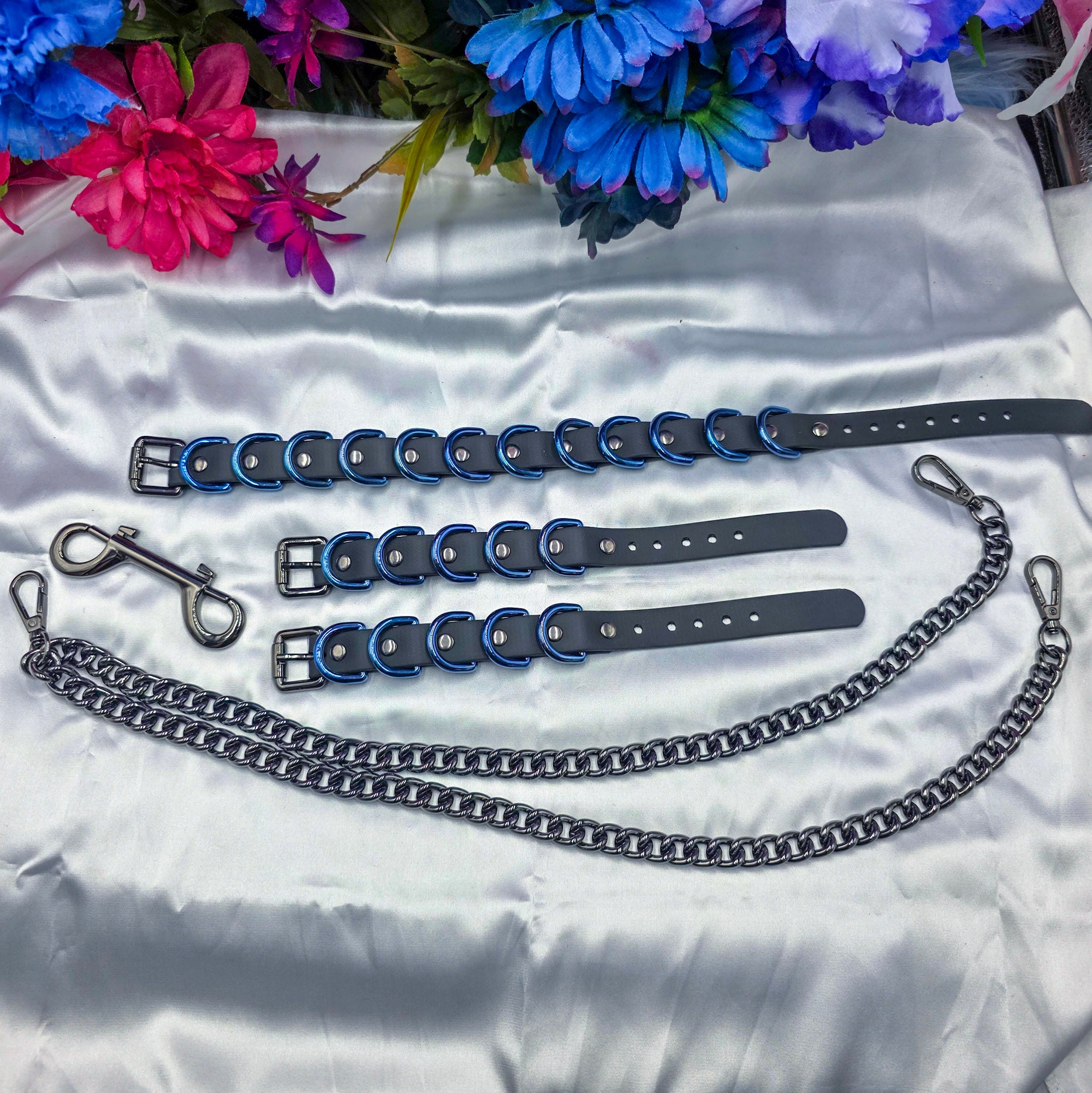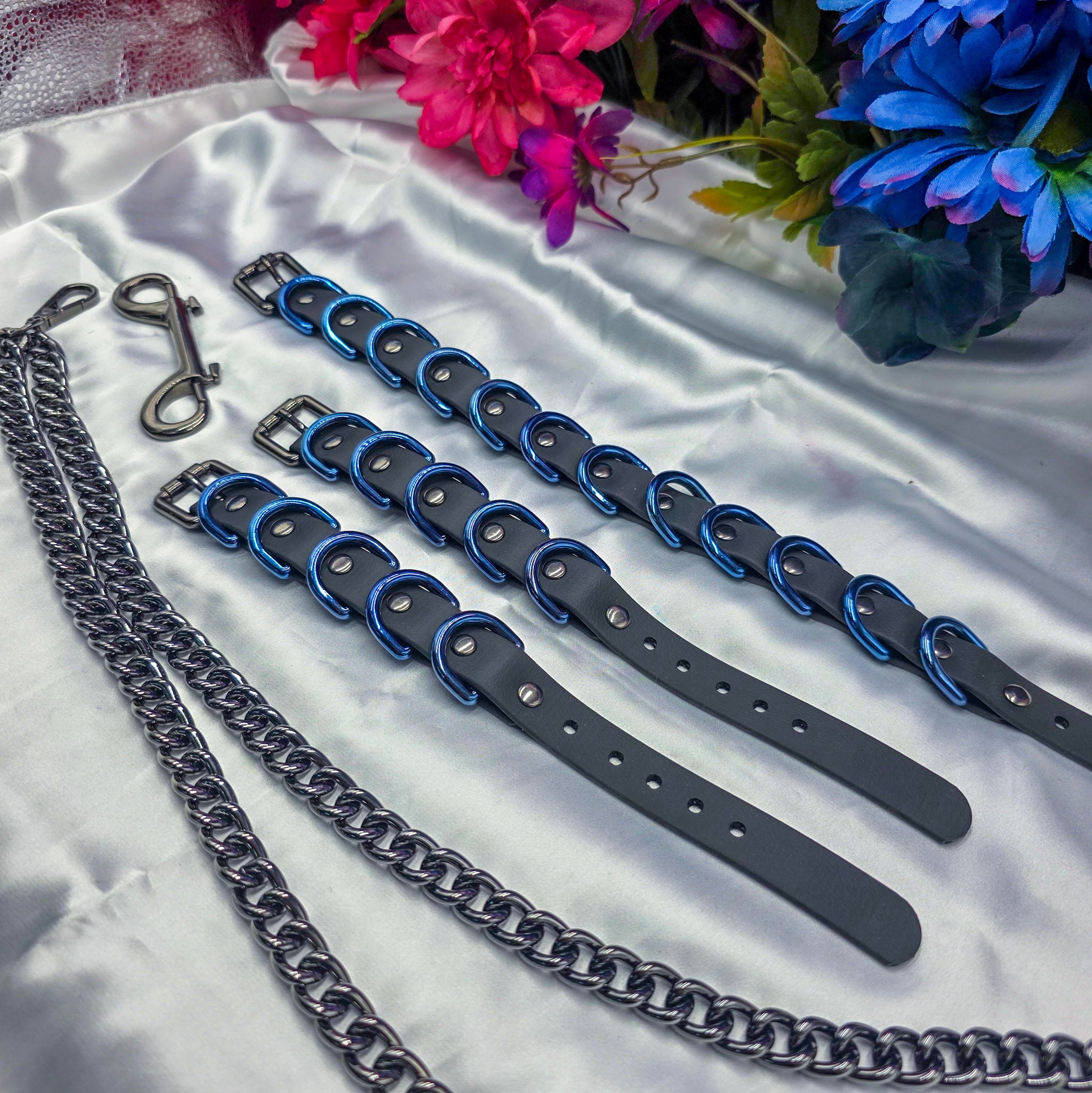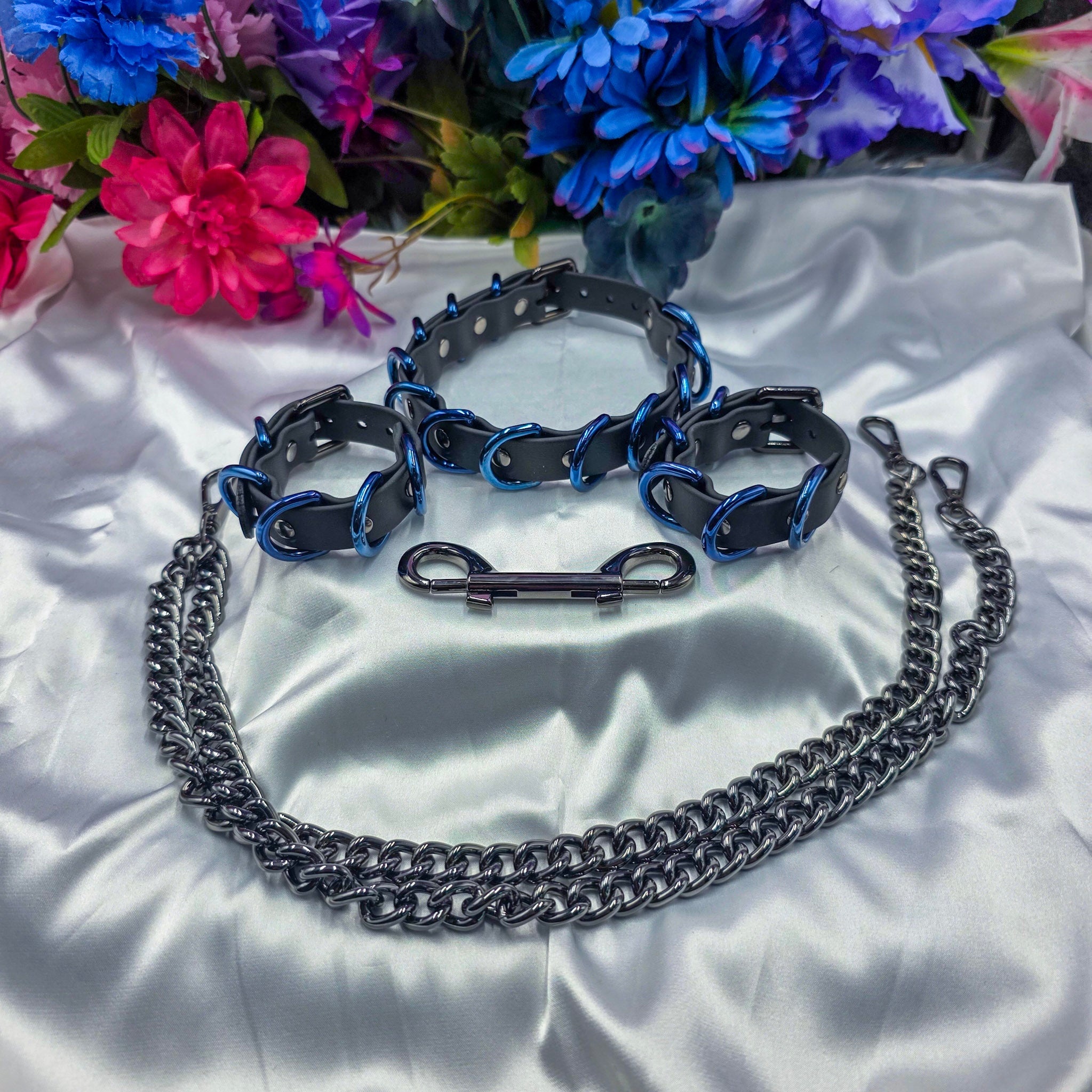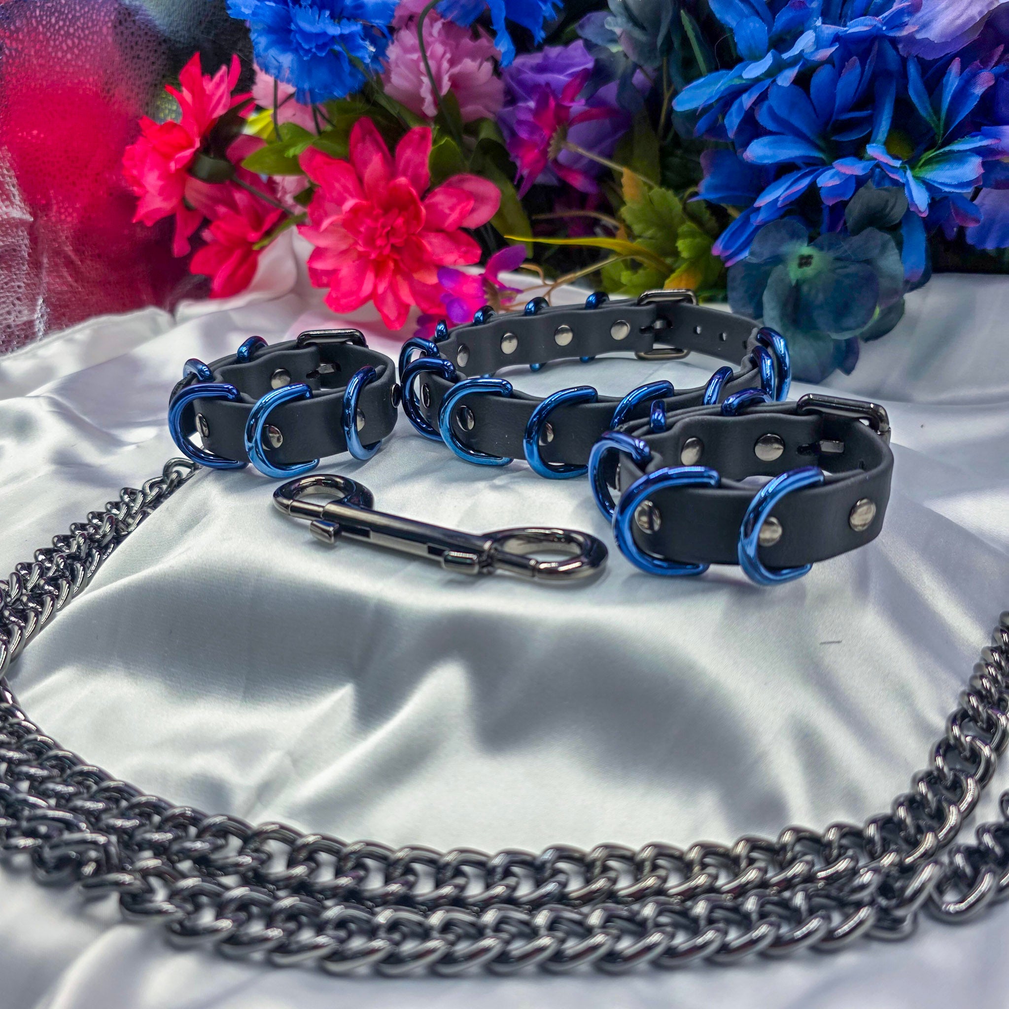 Some special cobalt blue d-rings I've had since 2023 that's finally getting used! This set is made on 3/4" faux leather Biothane with gunmetal hardware, adorned by cobalt blue d-rings.