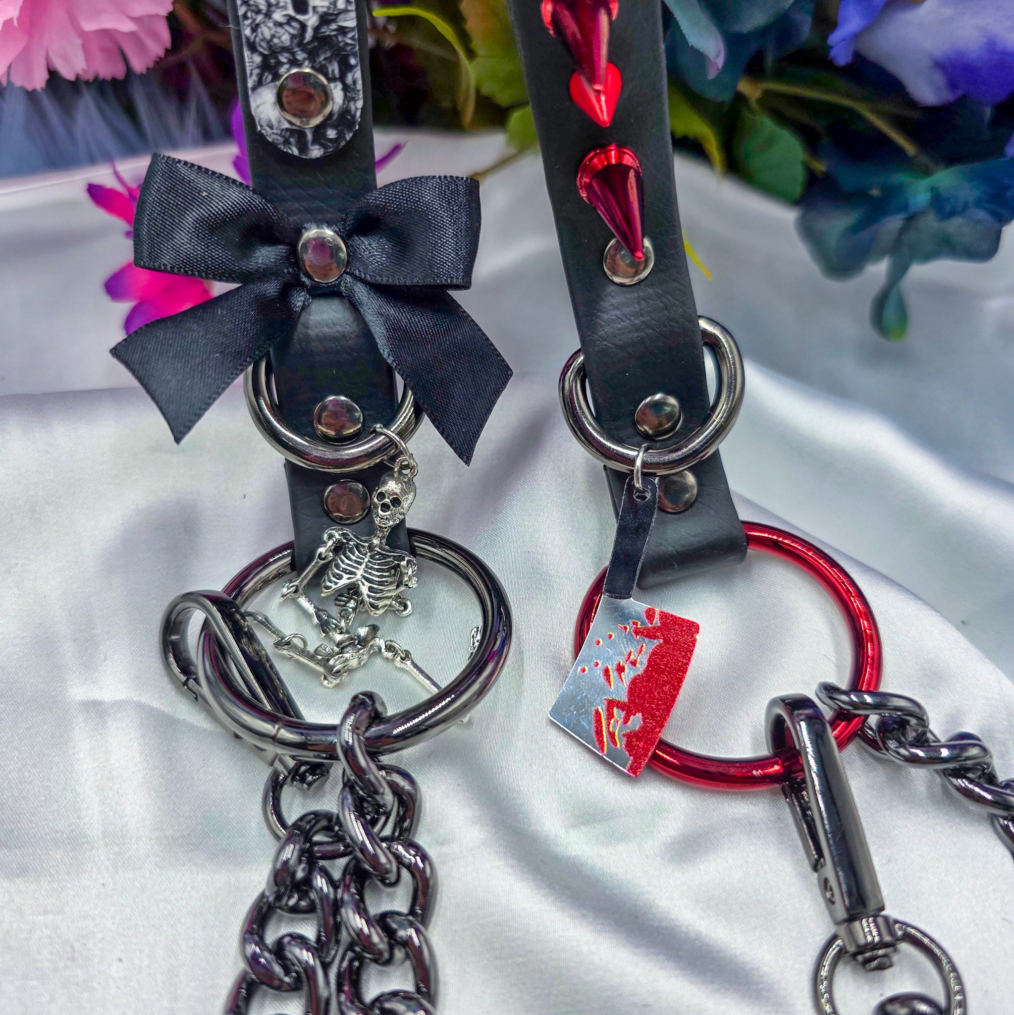 - Struck Leash - Features a 3/4" black base adorned by large metallic red spikes and small matte red spikes with a metallic red o-ring and a bloody hatchet charm.
