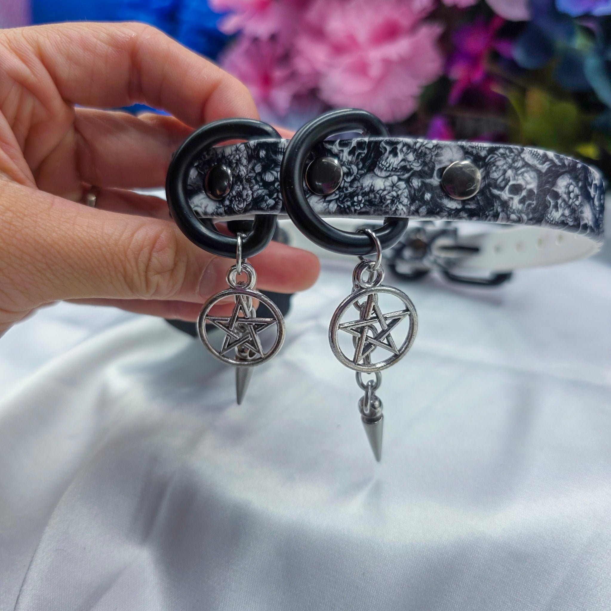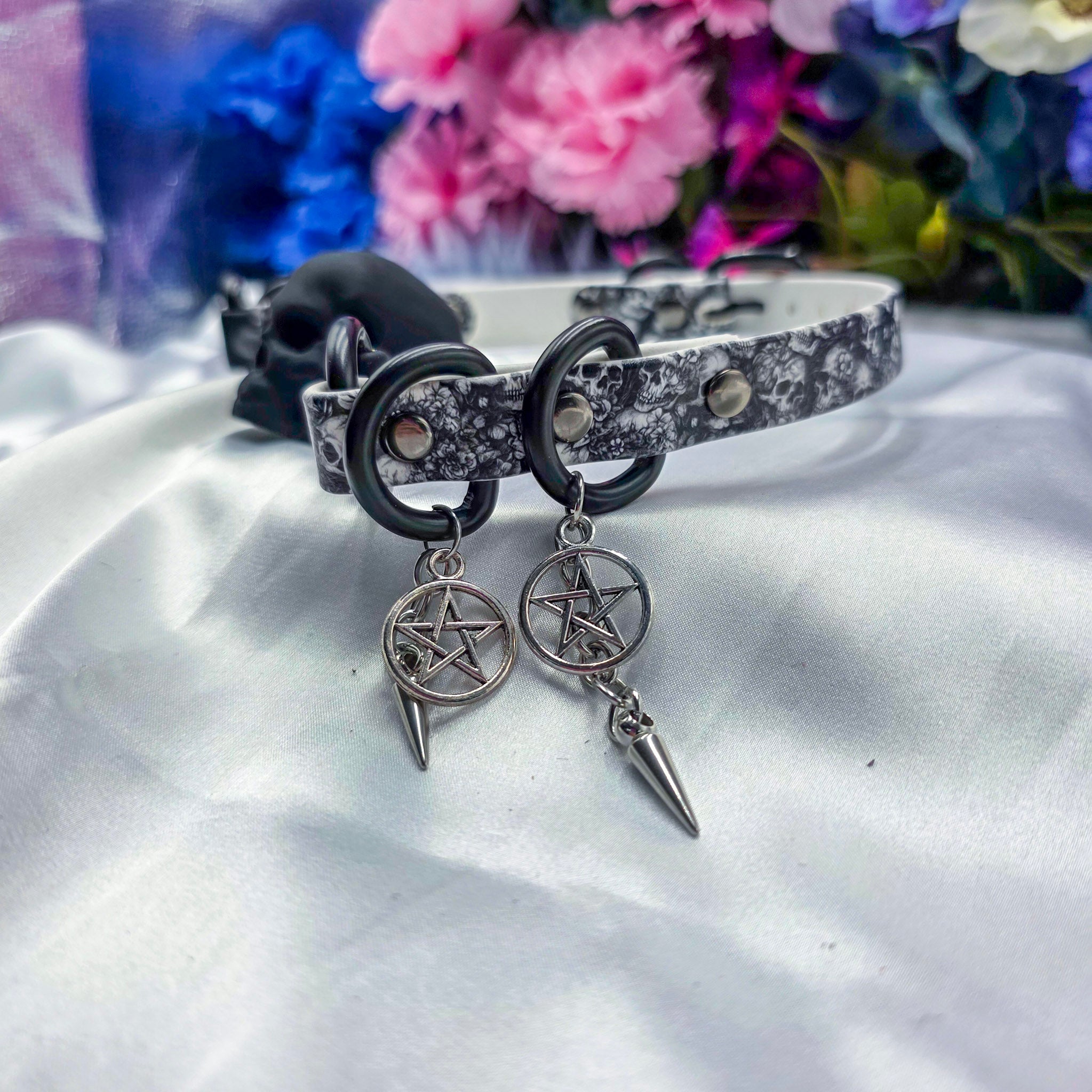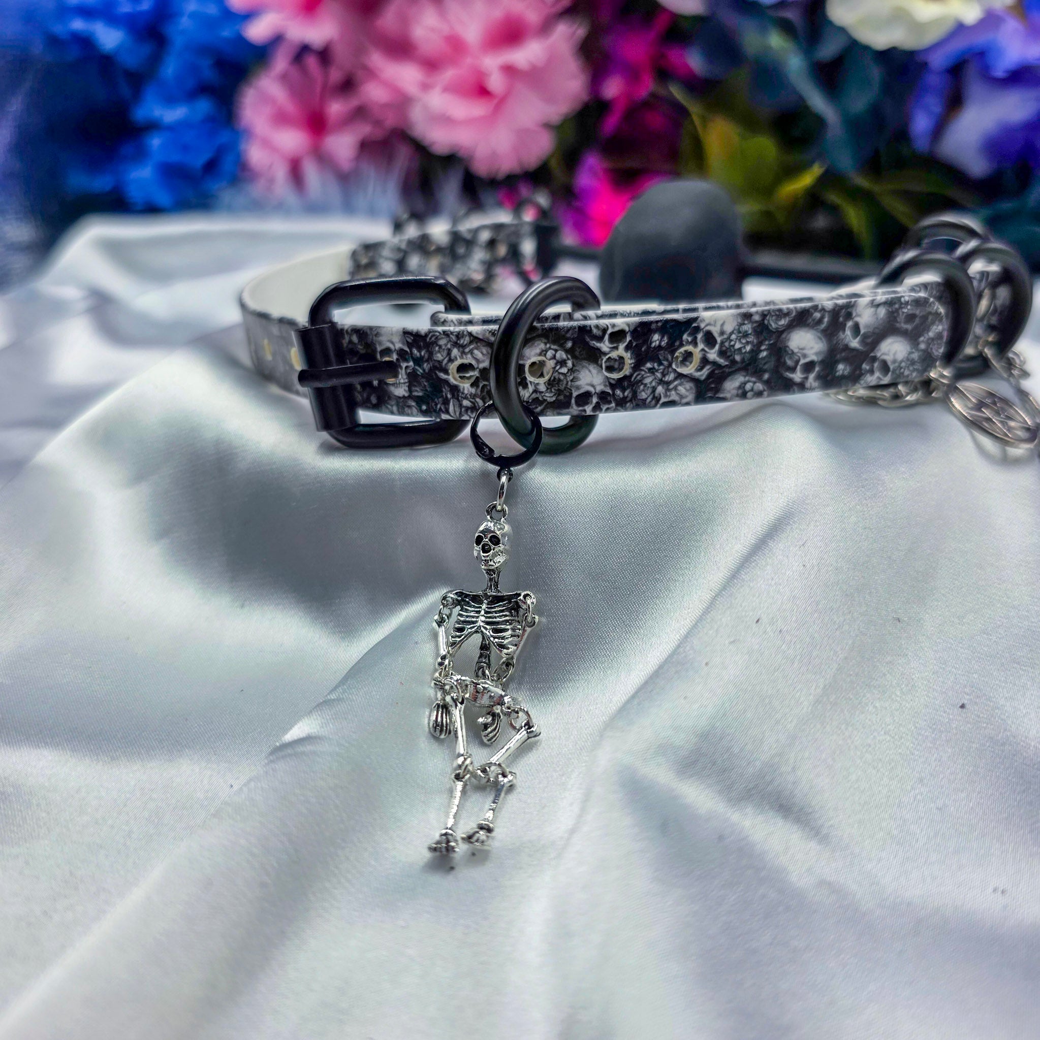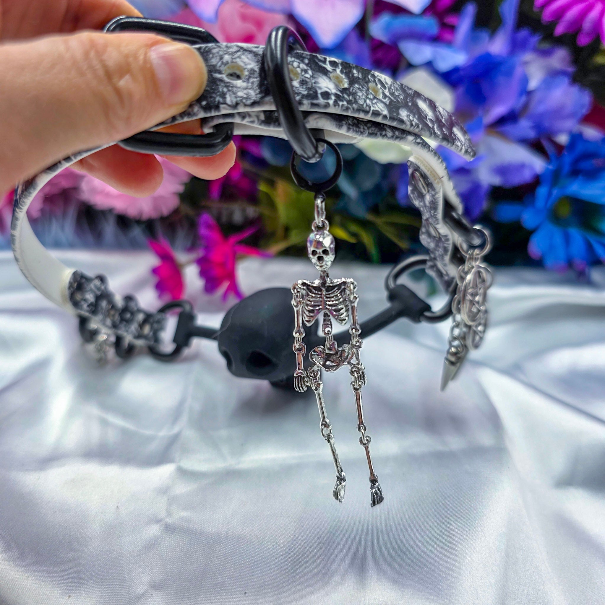 Part of the Spookyween 2025 drop! This gag features a UV printed monotone skull floral print and black skull gag centerpiece. Decorated with hanging pentacle charms, silver spikes, and a removable skeleton charm on the back.